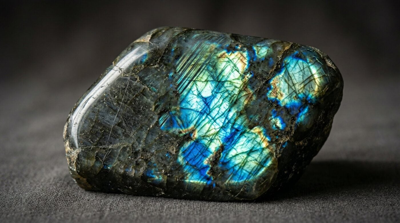 Labradorit er et plagioklasmineral kendt for labradorescens – det iriserende farvespil der opstaar i krystallen. Laer om egenskaber og forekomster.